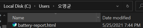powercfg/batteryreport 입력 후 엔터 해당 위치로 가면 battery-report 파일이 만들어진 것을 확인할 수 있다