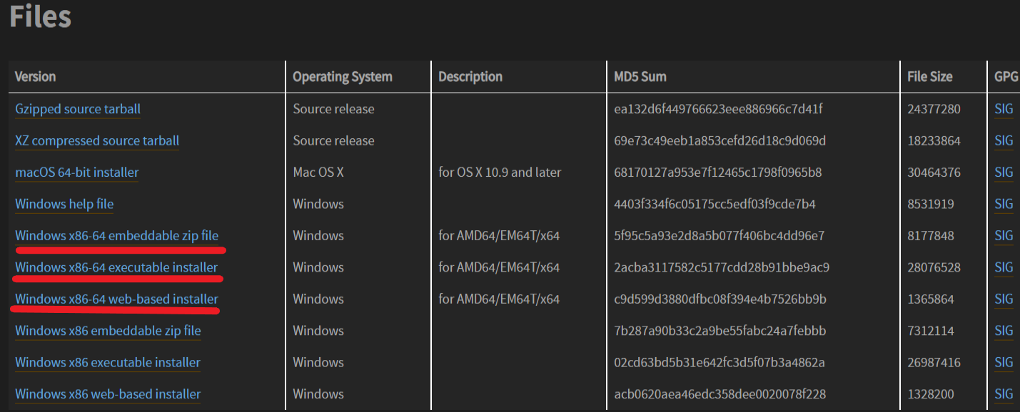 왼쪽 - 특정 버전의 파이썬 다운로드 페이지 / 오른쪽 - 본인 pc가 64 bit 라면 표시된 부분 중 하나를 설치하면 된다! (참고로, embeddable, executable, web-based 세 가지에 대한 설명은 다음의 링크를 참고하기 바랍니다! https://itissmart.tistory.com/71)