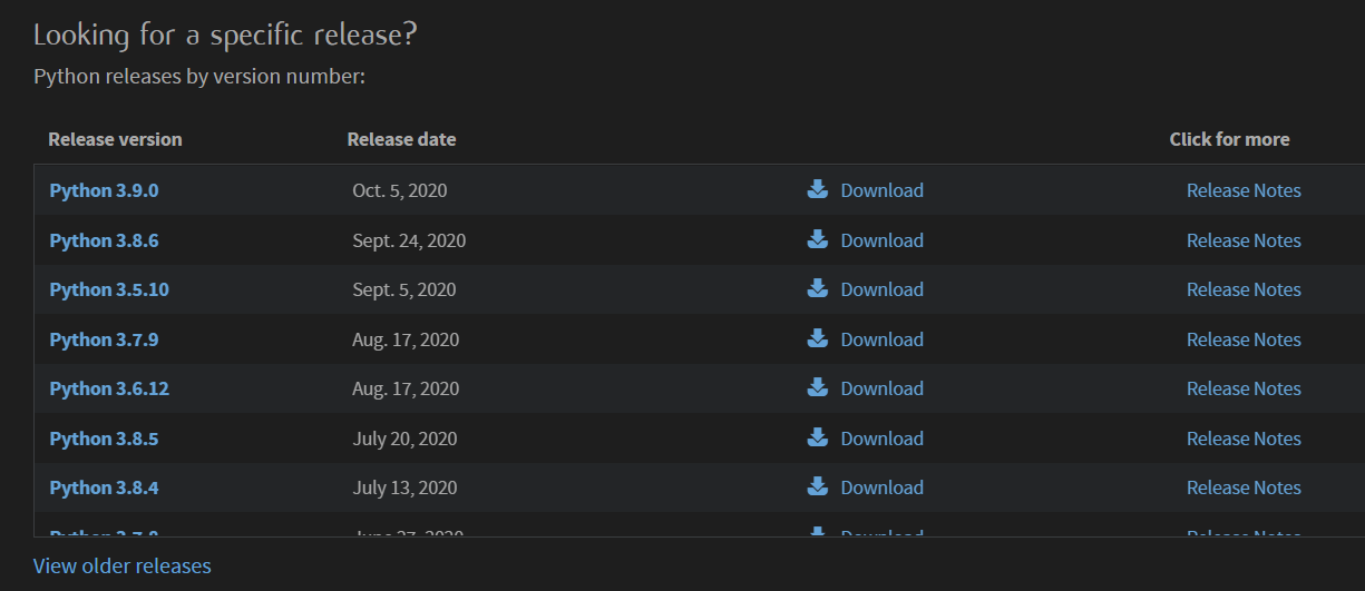 - 현재(20.12.04) 에는 Tensorflow 공식 홈페이지(링크)에서 지원되는 파이썬 버전을 확인할 수 있다.